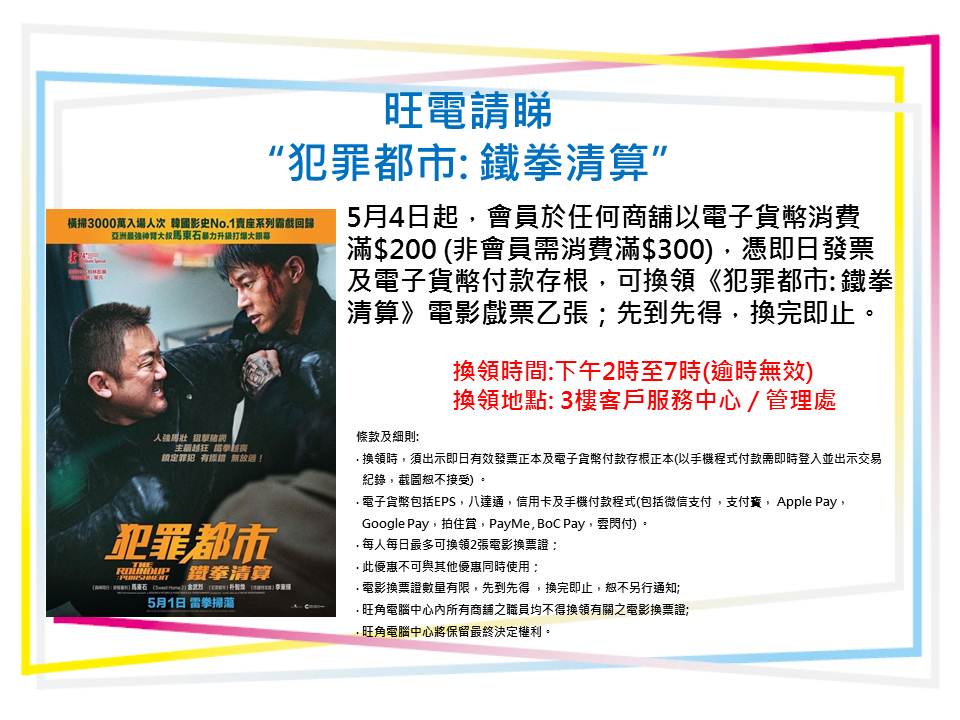 From 4 May 2024, MCC members with total spending of $200 by electronic payment (non- members are required to spend $300), are entitled to redeem ONE “The Roundup: Punishment” movie ticket coupon.