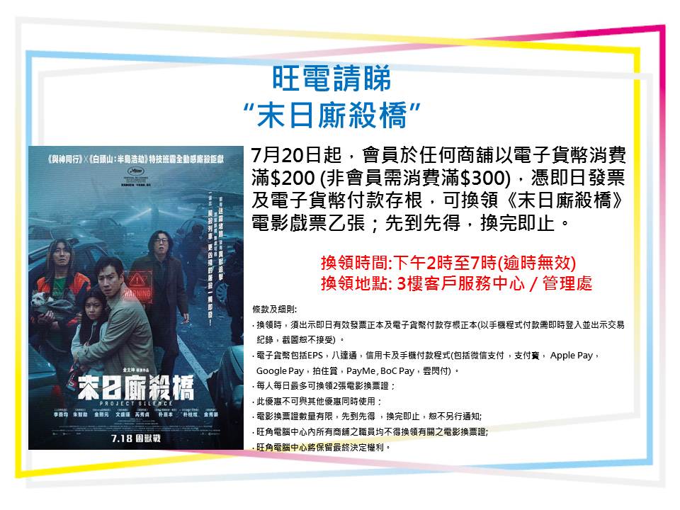 From 20 July 2024, MCC members with total spending of $200 by electronic payment (non- members are required to spend $300), are entitled to redeem ONE “Project Silence” movie ticket coupon.